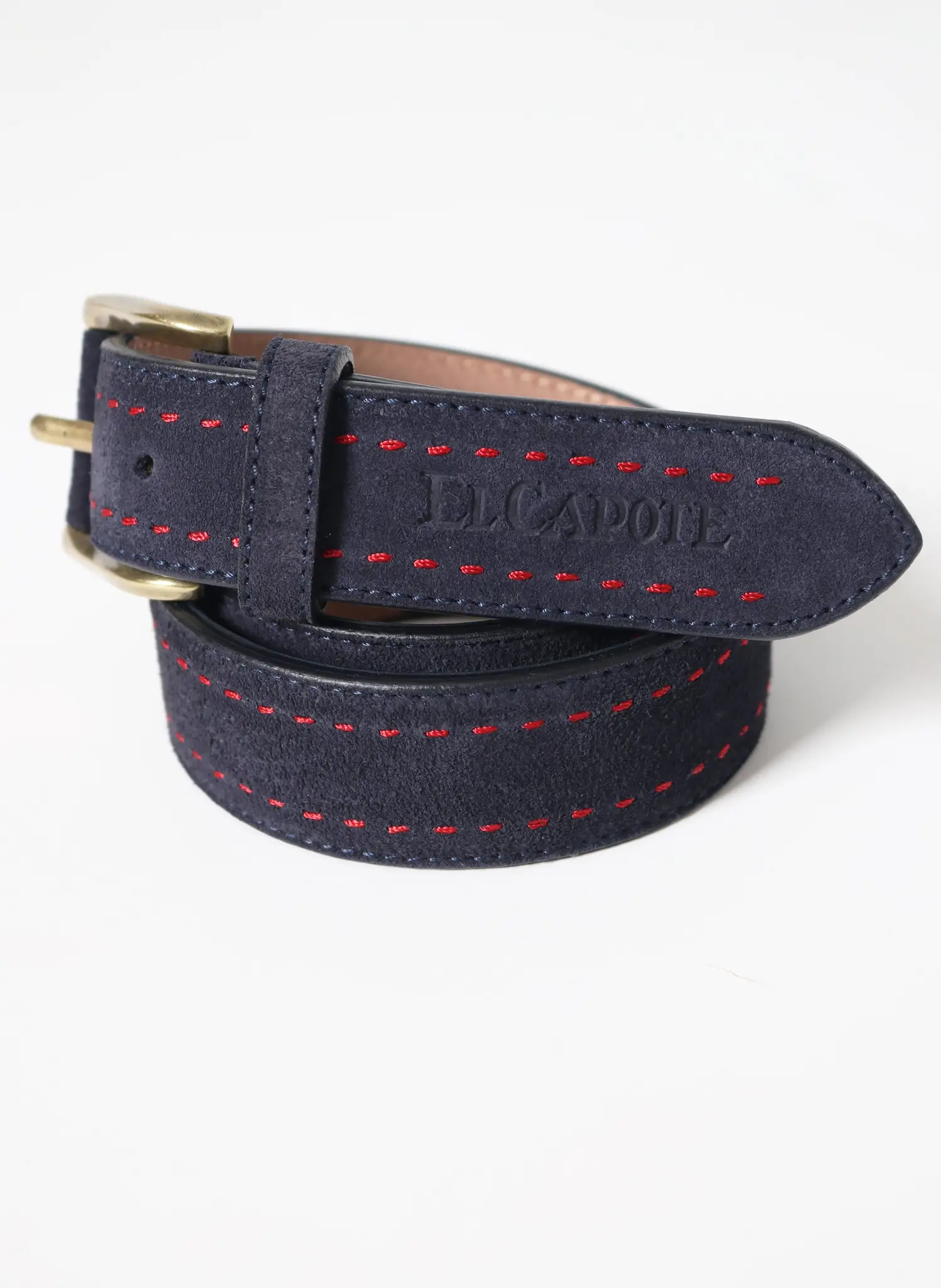 Cinturón realizado en serraje azul marino con pespuntes rojos. Lleva grabada la palabra EL CAPOTE. Hebilla dorada forrada.