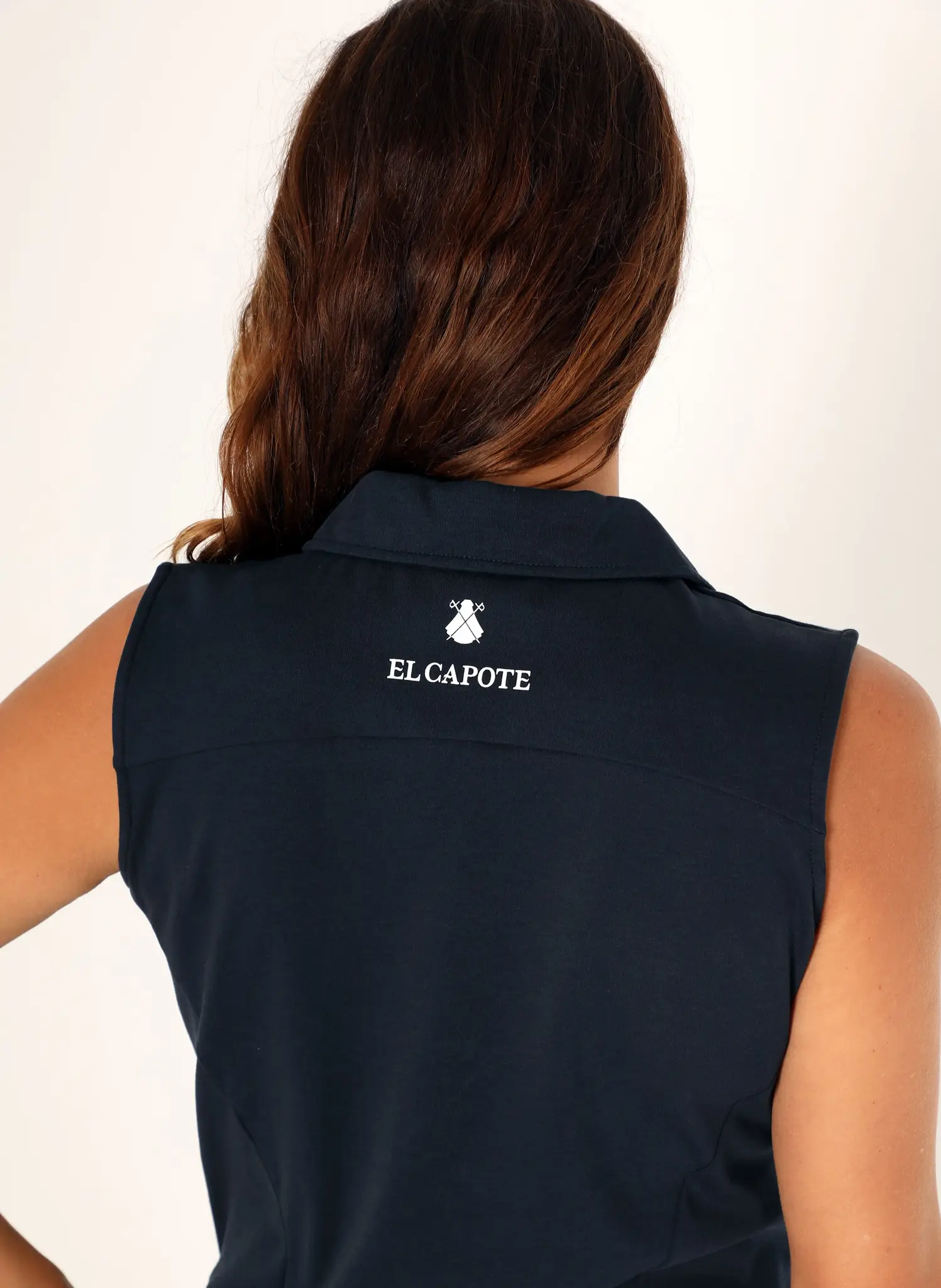 Polo azul marino sin manga con bandera de España dentro de la tapeta, tapeta de 4 botones, tejido interlock. Logo bordado en el pecho lado izquierdo en color blanco en 2 cm, serigrafía de El Capote en la nuca.