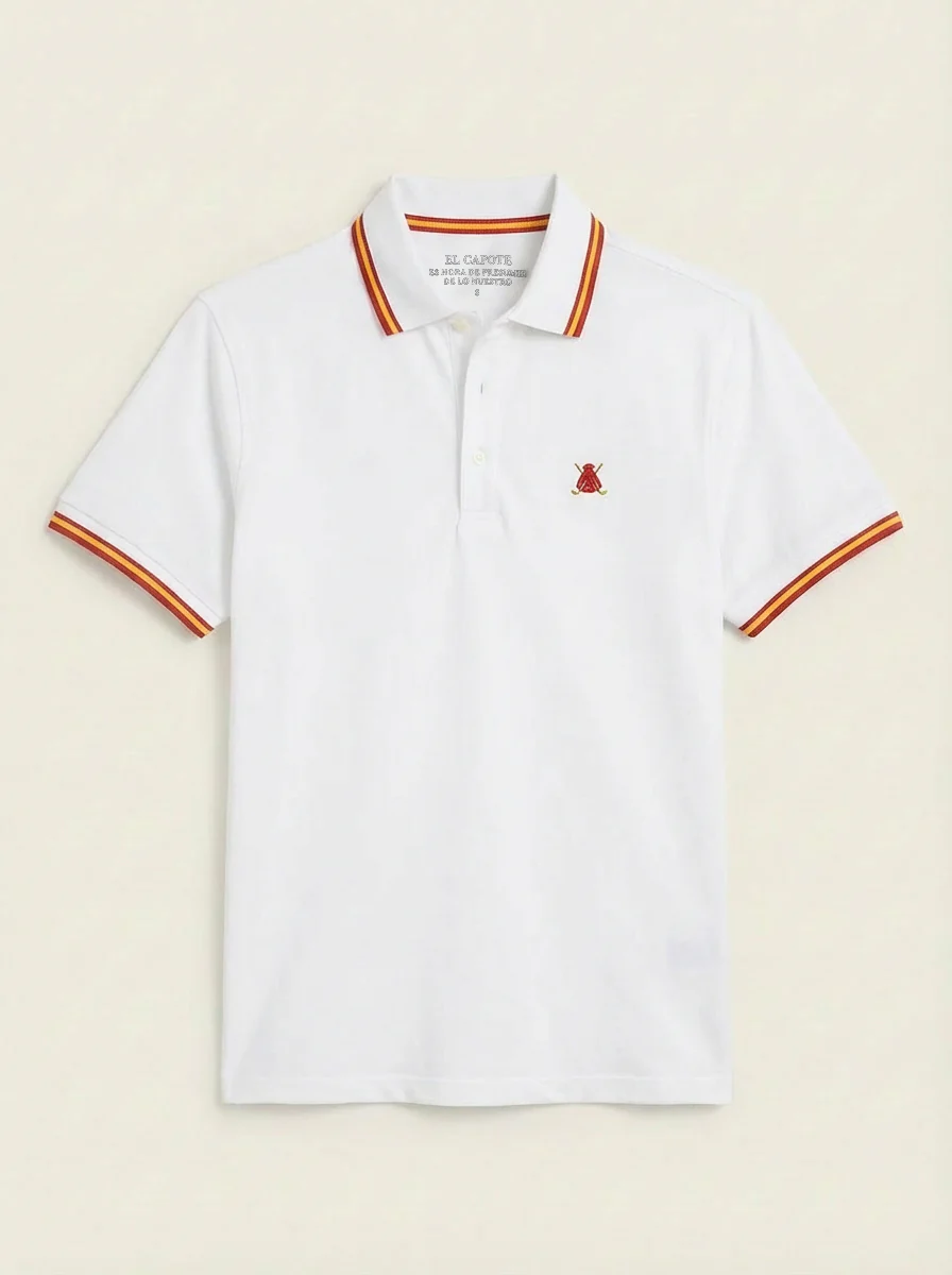 Polo Blanco con bandera de España en el borde del cuello y de las mangas. Tapeta de 3 botones los cuales van personalizados con la palabra EL CAPOTE, hecho en un tejido suave y elástico perfecto para hacer deporte o no pasar calor, ya que es un tejido fresco y fino, de bajo gramaje.