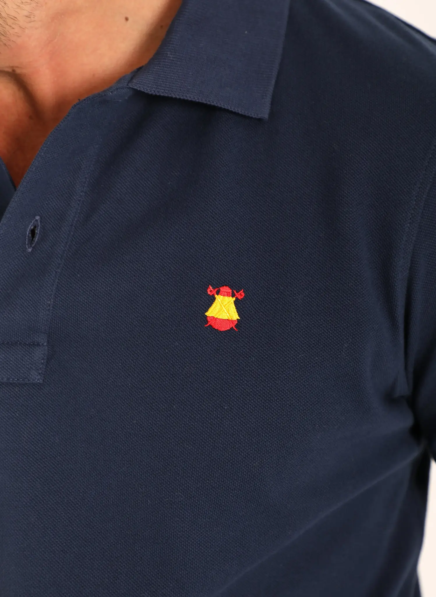 Polo de algodón de 180 gramos de la máxima calidad. Logo bordado en 2 cm en pecho con los colores de la Bandera de España. Botones personalizados y cubrecosturas al tono.